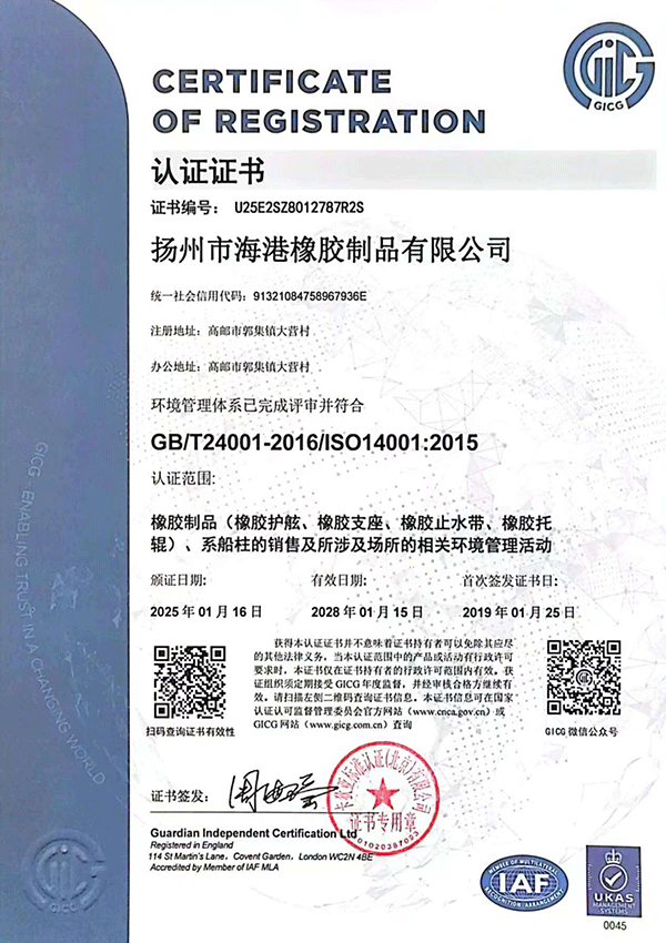 揚州市海港橡膠制品有限公司位于揚州市北郊,依傍于淮江、京滬高速公路,美麗的高郵湖緊鄰我公司,風景秀麗,水、陸暢通。我公司是專業生產橡膠制品的企業,生產近二十個系列上百種規格型號的橡膠護舷、橡膠止水帶,為滿足軍用碼頭的需要,又開發了各種規格的淺灰色橡膠護舷。擁有千萬元的生產規模,力量雄厚,檢測設備齊全。